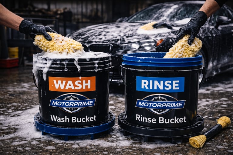 Antes de aplicar el método de los dos baldes, el vehículo debe haber pasado por un prelavado con foam lance o enjuague a presión.